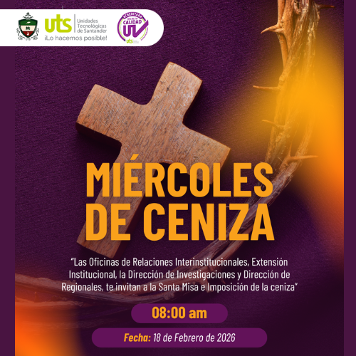Las Unidades Tecnológicas de Santander UTS, invita a la comunidad Uteísta a participar de la misa de miércoles de ceniza este 18 de febrero de 2026 en el Auditorio Hermano Luciano Andrés, del edificio Tekné (C).