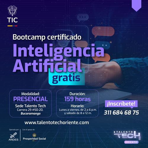 Prosperidad Social te invita a inscribirte en el Bootcamp GRATUITO en Inteligencia Artificial con Talento Tech Oriente (Ministerio de las TICS), una formación presencial, certificada y enfocada en habilidades digitales para el empleo.