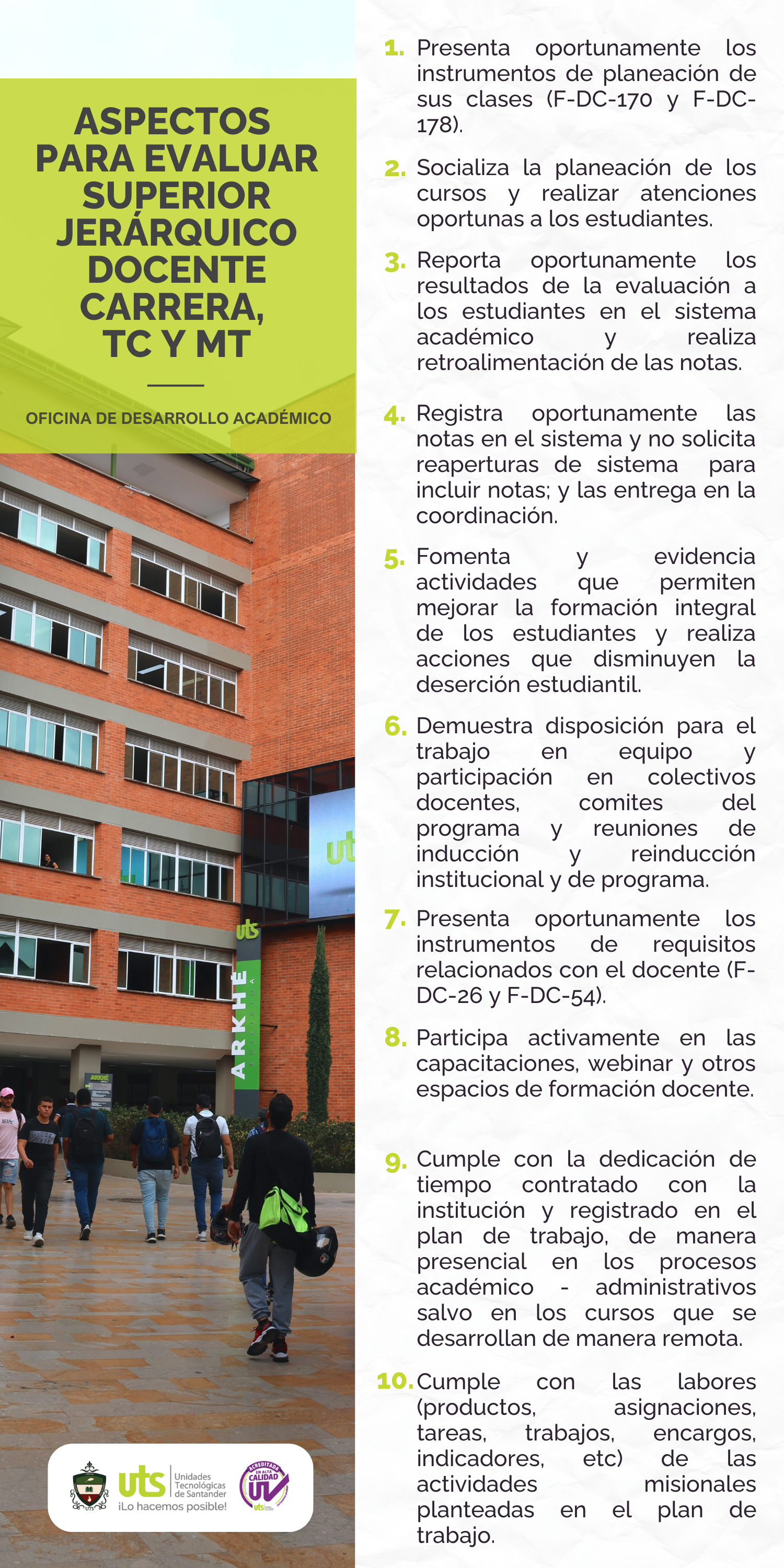 A partir del lunes 27 de septiembre y hasta el 17 de mayo de 2026, se desarrollará el proceso de Evaluación del Desempeño Docente para el período 2026-1, que integra a la comunidad educativa en un ejercicio crítico para valorar el desempeño de los profesores en la prestación del servicio educativo en los niveles Tecnológico y Universitario.